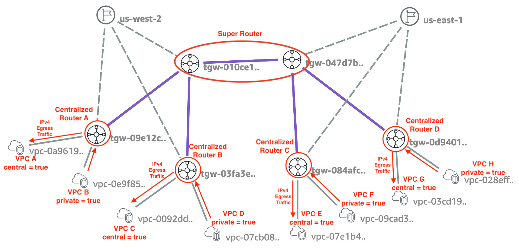 - Creates cross-region V×V routing expansions so that VPCs in different regions inherit full reachability.